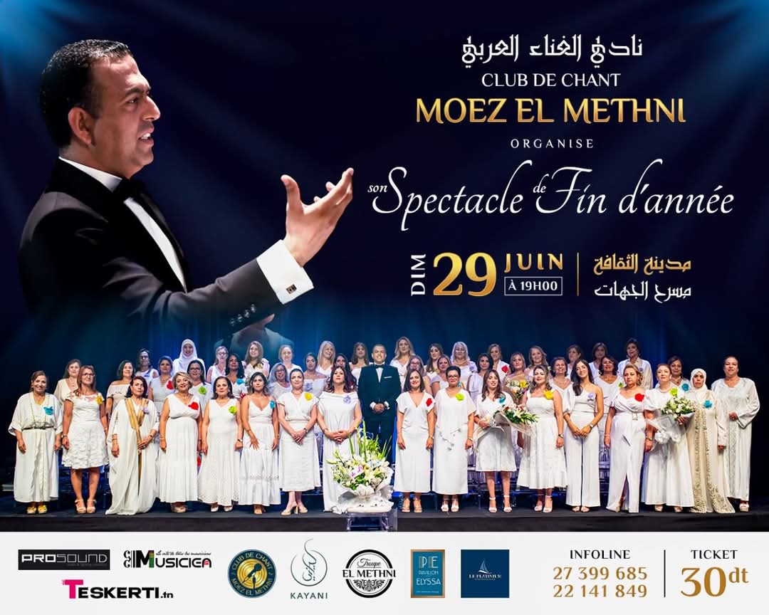 الصفحة الرئيسية ثقافة و فنونحفل استثنائي لنادي الغناء العربي بقيادة “معز المثني”:الأحد 29 جوان 2025 – مدينة الثقافة بتونس (مسرح الجهات)