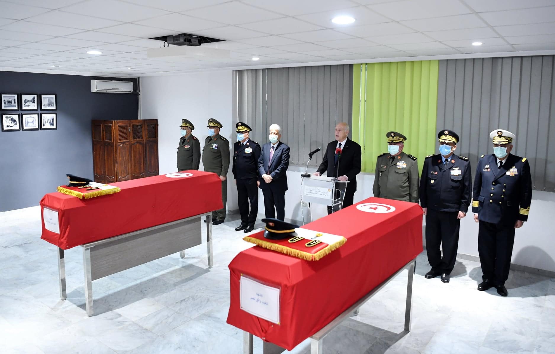 أشرف رئيس الجمهورية قيس سعيد، اليوم الثلاثاء 4 جانفي 2022 بالمستشفى العسكري بتونس العاصمة، على موكب تأبين الشهيدين النقيب البشير السعيداني والنقيب واثق نصر.