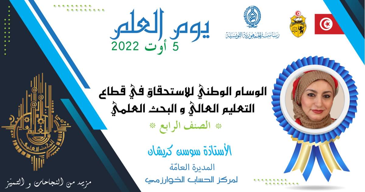بمناسبة الاحتفال بيوم العلم التأم ظهر اليوم الجمعة 5 أوت 2022 بقصر قرطاج حفل تكريم عدد من المتفوّقين على الصعيد الوطني من باحثين وطلبة، بحضور رئيسة الحكومة السيدة نجلاء رمضان بودن و عدد من أعضاء الحكومة و الديوان الرئاسي، وقد منح رئيس الجمهورية التونسية قيس سعيد الوسام الوطني للاستحقاق – الصنف الرابع- للأستاذة سوسن كريشان، المديرة العامّة لمركز الحساب الخوارزمي، اعترافا لها باسهاماتها في الرقي بالخدمات المسداة لمستعملي الشبكة الوطنية الجامعية وتثمينا لجهودها المبذولة خلال فترة إدارتها للمركز و الانجازات المحقّقة لفائدة قطاع التعليم العالي و البحث العلمي.