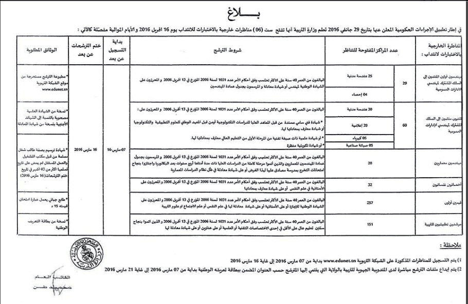 الرئيسية » وزارة التربية تفتح 6 مناظرات خارجية لانتداب قيمين ومرشدين وتقنيين ومهندسين