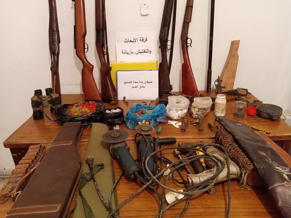 تمكنت، يوم 04 جانفي 2022 بمنطقة الشرعية قلعة الأندلس، فرقة الأبحاث والتفتيش للحرس الوطني بأريانة من الكشف عن محل معد لصنع و إصلاح بنادق الصيد غير مرخص فيه و القاء القبض على 03 أشخاص و حجز 04 بنادق صيد و 57 خرطوشة و 94 خرطوشة فارغة و 03 آلات ضغط و شحن خراطيش و غمد جلدي و كمية من الرش و آلات لحام و ثقب و منظار نهاري. باستشارة النيابة العمومية اذنت بالاحتفاظ بهم و اتخاذ الاجراءات القانونية اللازمة.