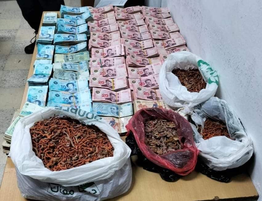 في إطار مكافحة التهريب على كامل التراب الوطني، تمكنت دوريّة تابعة لفرقة الحرس الديواني بمنزل بورقيبة إثر عمل استعلامي، من ضبط أحد الأشخاص بحوزته كمية هامة من المرجان المهرب ومبلغ من الدينارات التونسية لا يتحوز في شأنها على أية وثيقة تثبت شرعية مسكها حيث على إثر رصد سيارة رباعية الدفع قادمة من جهة تونس وبايقافها واخضاعها للتفتيش، تم العثور داخلها على مبلغ مالي من العملة التونسية قدره 104 الف دينار دون أية وثيقة قانونية كما تم العثور على عدد 7 كلغ من المرجان المهرب مخفية باحكام داخل كيس بلاستيكي بمحيط محرك السيارة .