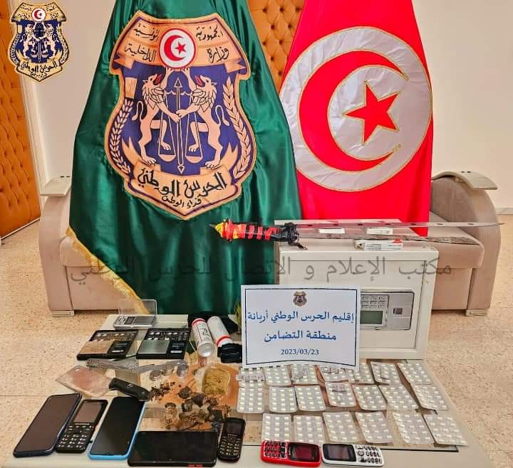 في إطار تعقب العناصر المفتش عنها و التي تهدد الأمن العام تمكنت وحدات تابعة لمنطقة الحرس الوطني بالتضامن معززة بحضائر تدخلات سريعة بإقليم الحرس الوطني بأريانة وبن عروس و حضيرة تدخل مركزي تابعة لفوج التدخل بنعسان و بعد إستشارة النيابة العمومية من مداهمة منازل المفتش عنهم و ضبط عدد 09 أنفار صادرة في شأنهم عدة مناشير تفتيش لفائدة وحدات أمنية و هياكل قضائية مختلفة من أجل تورطهم في قضايا مختلفة كما تم حجز كمية من مخدر القنب الهندي ، أقراص مخدرة و مبلغا ماليا متأتيا من عائدات ترويج المخدرات لدى أحد المفتش عنهم.