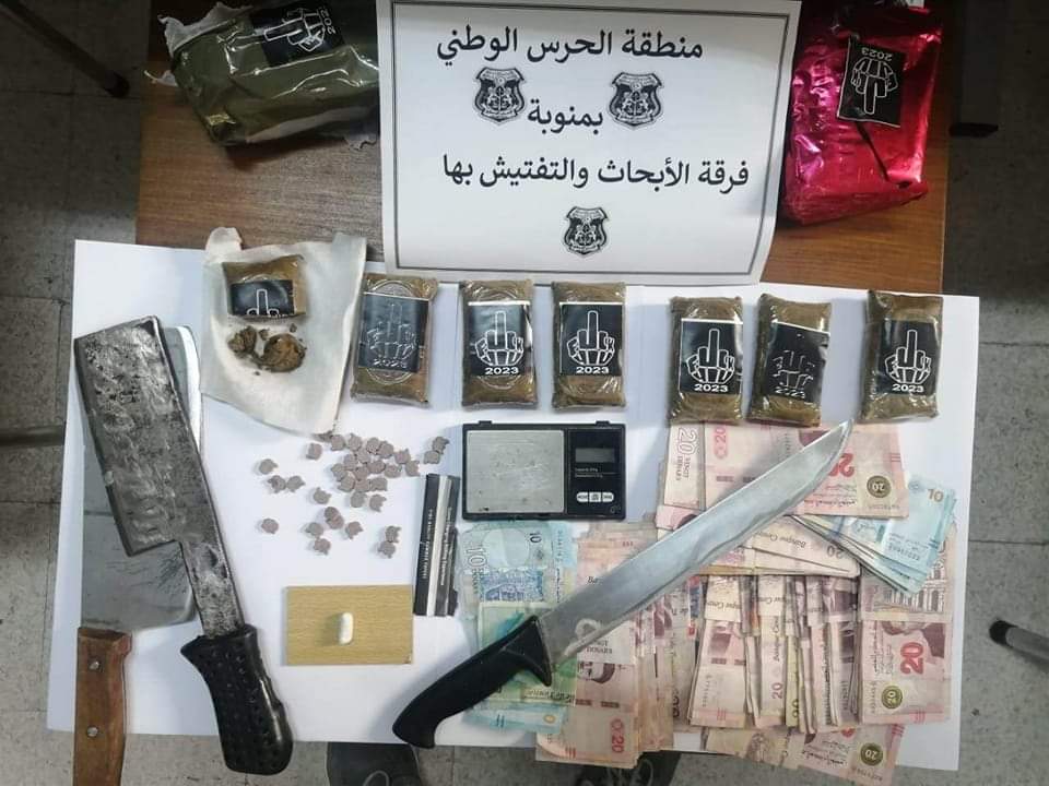 في إطار سعي وحدات الحرس الوطني للحد من ظاهرة إستهلاك و ترويج المخدرات و على إثر توفر معلومات لدى فرقة الأبحاث والتفتيش للحرس الوطني بمنوبة مفادها تعمد شخص أصيل الجهة ترويج المخدرات بإيلاء الموضوع الأهمية اللازمة داهمت يوم 25 مارس 2023 دورية تابعة للوحدة المذكورة معززة بدورية تابعة لفرق الطريق العمومي بمنوبة و التدخلات السريعة بتونس و حضيرتين تابعتين لفوج التدخل بنعسان منزل النفر المذكور و تم حجز عدد 06 صفائح من مخدر القنب الهندي ، أقراص مخدرة ، كمية من مخدر الكوكايين و مبلغا ماليا متأتيا من عائدات الترويج.