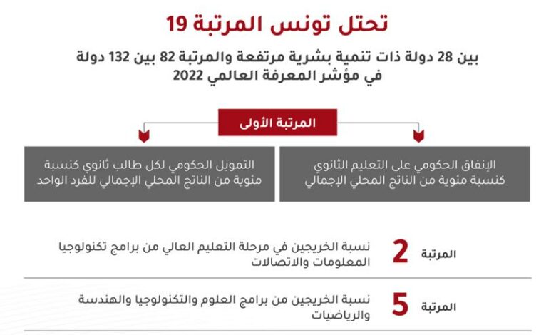 – أظهرت نتائج الإصدار الأخير من “مؤشِّر المعرفة العالمي”، الصادر عن برنامج الأمم المتحدة الإنمائي بالتعاون مع مؤسَّسة محمد بن راشد آل مكتوم للمعرفة، مواصلة تونس تقديم مستويات الأداء المرتفع من ناحية البنية التحتية المعرفية خلال العام 2022، حيث حصدت المرتبة 19 بين 28 دولة ذات تنمية بشرية مرتفعة والمرتبة 82 بين 132 دولة في نسخة عام 2022 من المؤشِّر.