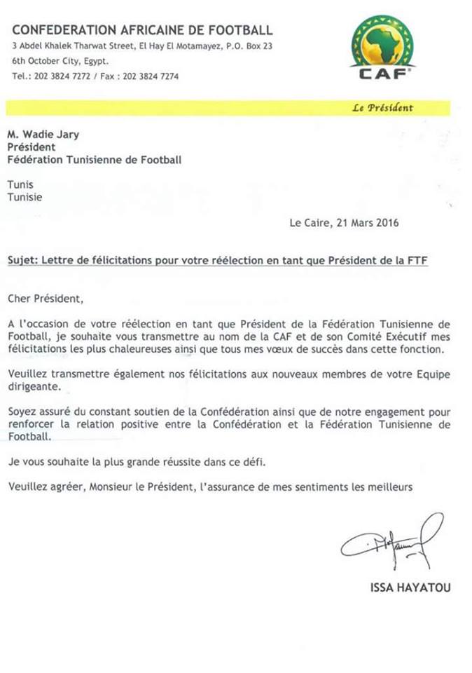 وجّه رئيس الاتحاد الافريقي لكرة القدم (الكاف) عيسى حياتو اليوم الأربعاء 23 مارس 2016 برقية تهنئة لوديع الجريء بمناسبة إعادة انتخابه رئيسا للجامعة التونسية لكرة القدم.