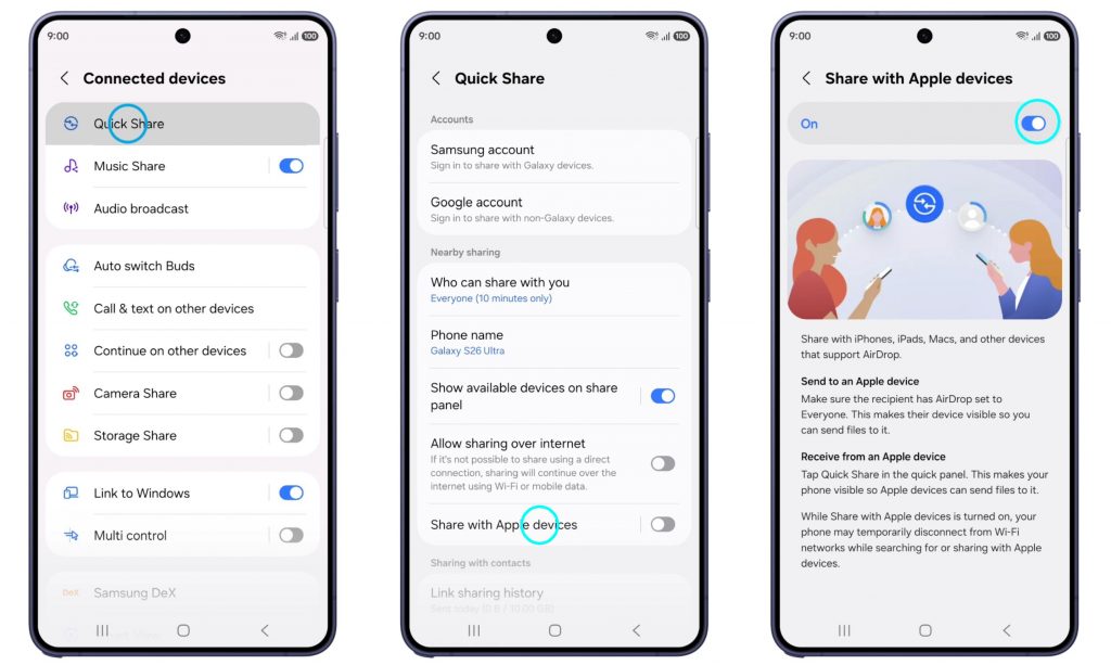 سامسونج تضيف دعم AirDrop إلى ميزة Quick Share في سلسلة Galaxy S26: