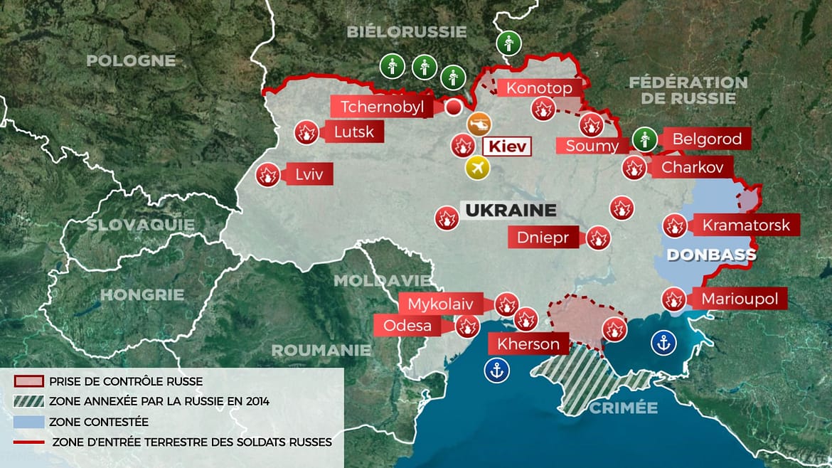 تدخل العملية العسكرية الروسية في أوكرانيا، الثلاثاء، يومها السادس، فيما تجددت الغارات الجوية الروسية على مدن كييف وخاركيف وخيرسون، بحسب ما أفاد مراسلي جلّ الفضائيات في العاصمة الأوكرانية، كما أشار إلى أن محاولة إنزال جوي روسية جرت صباح اليوم شمال كييف.